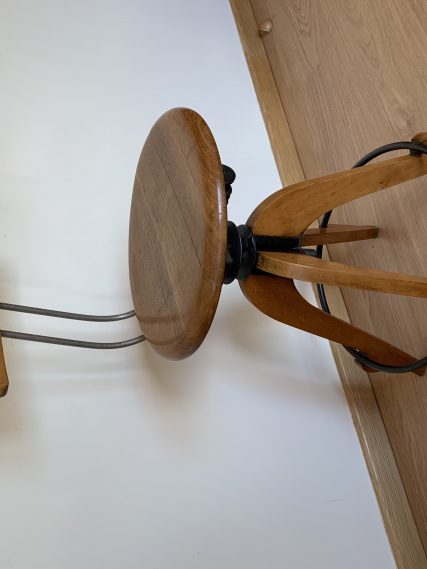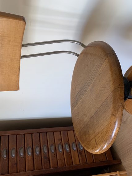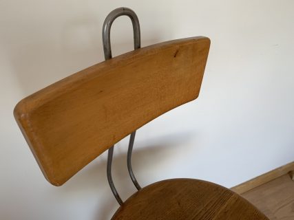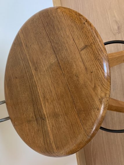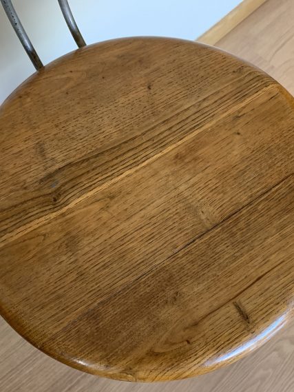 Authentic and beautiful industrial American oak stool. Very robust, with American oak legs, seat and back in excellent condition and with a beautiful patina.
