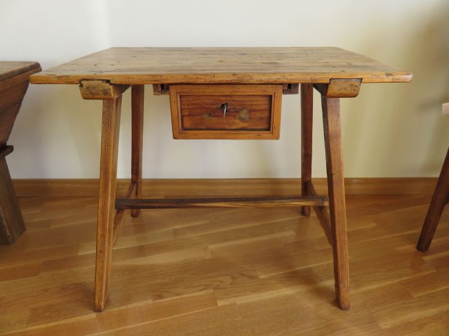 ArtículoArtículo Mesa tocinera de matanza antigua Ref: A035 VENDIDA Curiosa mesa tocinera antigua de matanza con su cajón, cerradura y llave. Bonita pátina de color roble en tablero y patas. Traveseras laterales de las patas con señales de uso y trabajadas con bonitas cenefas en la parte inferior. Tocinera de calidad. Restaurada preservando su identidad…