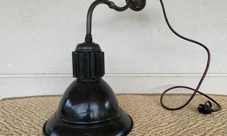 ArtículoArtículo Lámpara Industrial Antigua Vintage Ref: F004 VENDIDA Auténtica lámpara industrial de pared con pantalla de porcelana esmaltada. De color verde-negro oscuro en el exterior y blanco en el interior. Bonita forma, pátina y con señales de uso. Con brazo soporte de hierro auténtico limpiado y restaurado. Recableada con cable grueso industrial, enchufe de seguridad…