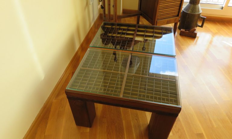 ArtículoArtículo Mesa de centro con cajones de chilabete y cristal Ref: B031 € 430.00 Mesa baja compuesta por 2 cajones antiguos de chilabete, 2 cristales de seguridad, 1 base gruesa de pino maciza, y 4 patas de madera maciza de viga estilo rústico. Mueble muy robusto y consistente. La mesa dispone de 2 antiguas cajoneras…