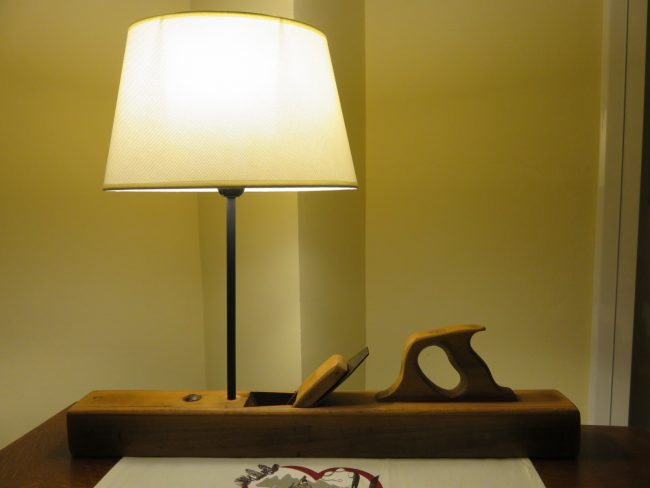 ArtículoArtículo Lámpara garlopa en madera natural Ref: B0017 € 140.00 Antigua garlopa de carpintero ede madera natural convertida en cálida lámpara de sobremesa. Completa y en muy buen estado. Incluye base con maneta de sujeción, hoja de corte original, falca ajustadora, columna portalámparas lacada en negro y pantalla ovalada en color crema. Garlopa auténtica, con…