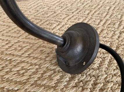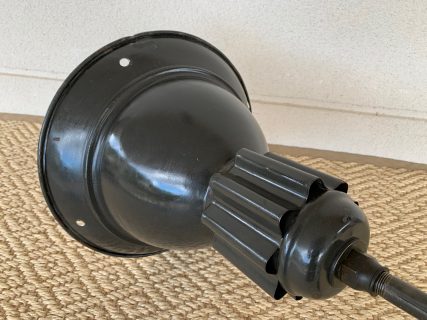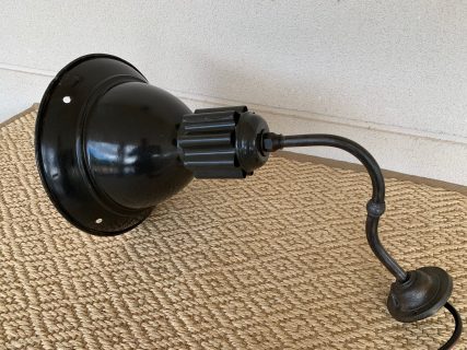 Authentic industrial wall lamp with enamelled porcelain lampshade. Dark green-black on the outside and white on the inside. Nice shape, patina and signs of use. With authentic iron support arm cleaned and restored. Rewired with heavy duty industrial cord, new safety plug and vintage accent light bulb. Ideal for exterior or interior. Beautiful and authentic.