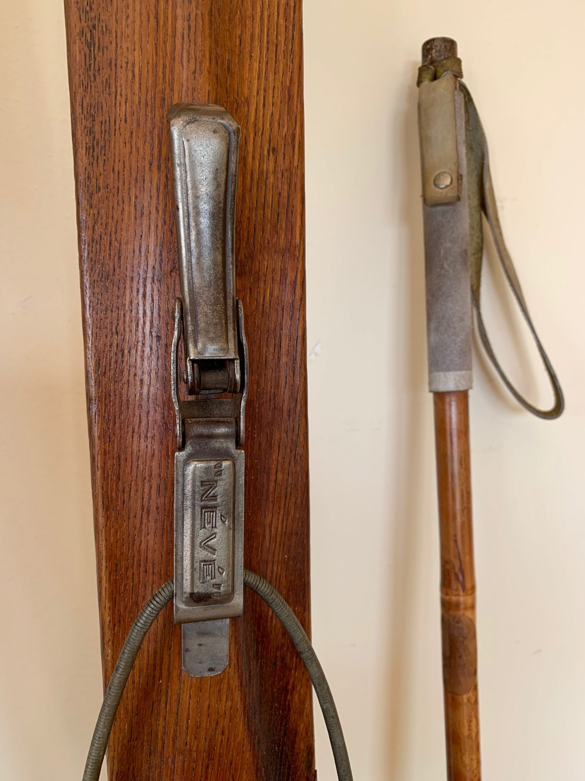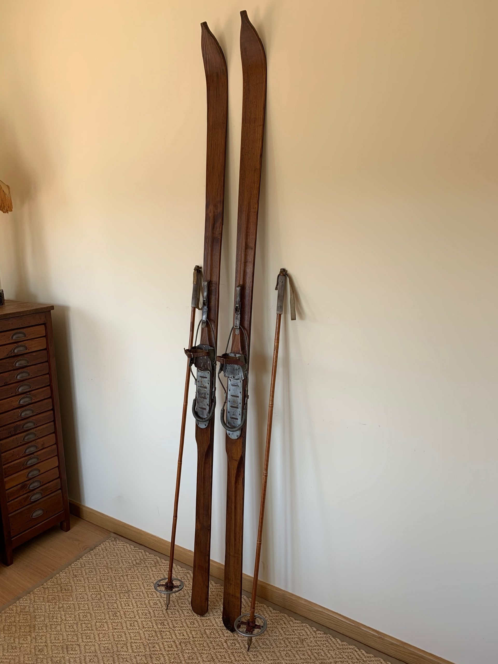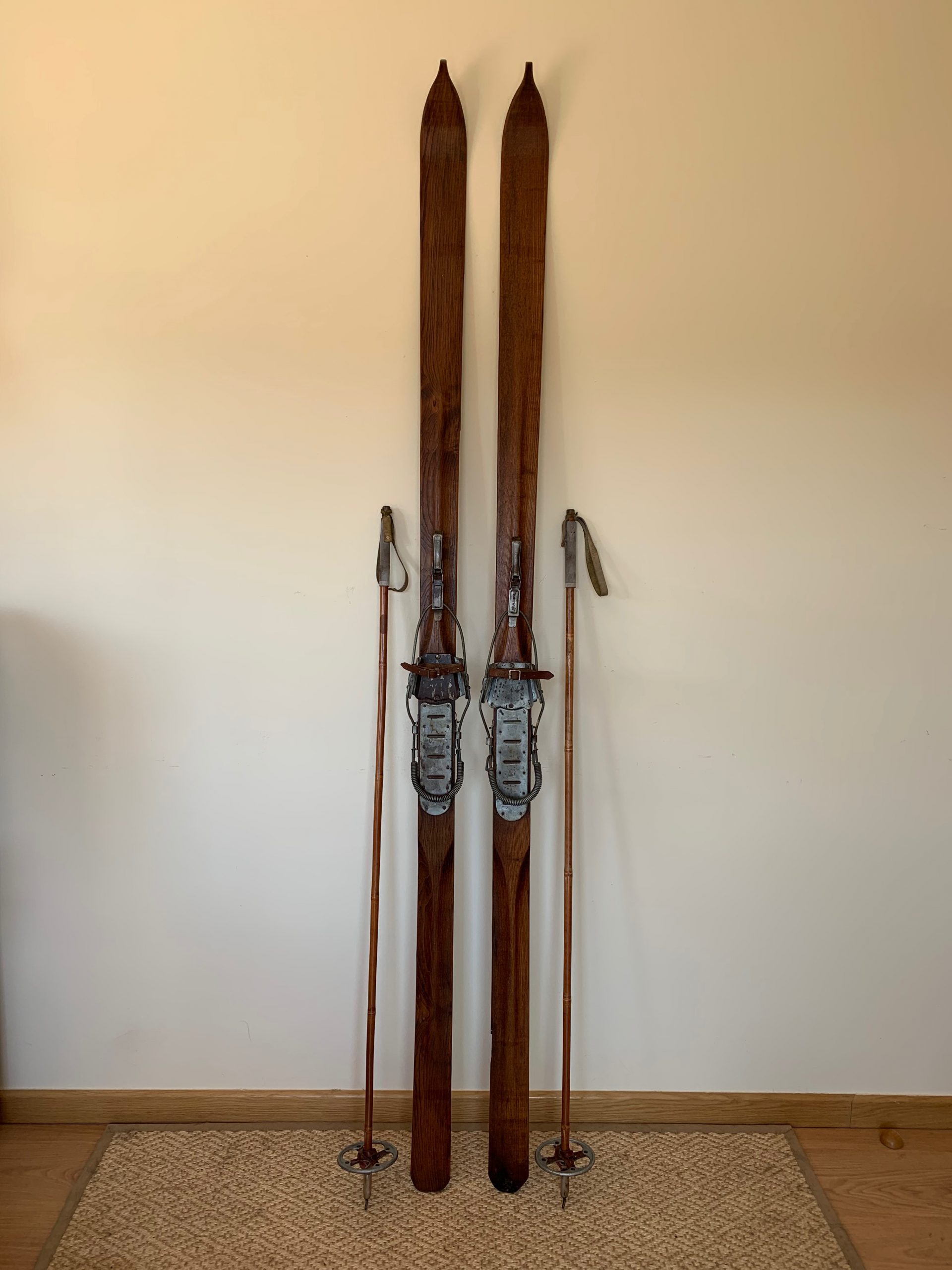 Preciosos esquís alpinos de madera antiguos y bastones. Enormes, completos y originales con preciosa pátina. Madera en relieve, robusta y acabados con las clásicas puntas. Con fijaciones y tiradores Nevé, reposa pies originales y correas de cuero. Bastones de bambú clásicos Korpela fabricados en Finlandia. Empuñaduras y brazaletes de cuero, con discos metálicos y tiras de cuero de 4 puntas. Restaurados conservando su estado original. Preciosa pátina en tono roble medio. Excelente estado! Listos para colgar en la pared de casa de montaña o refugio.