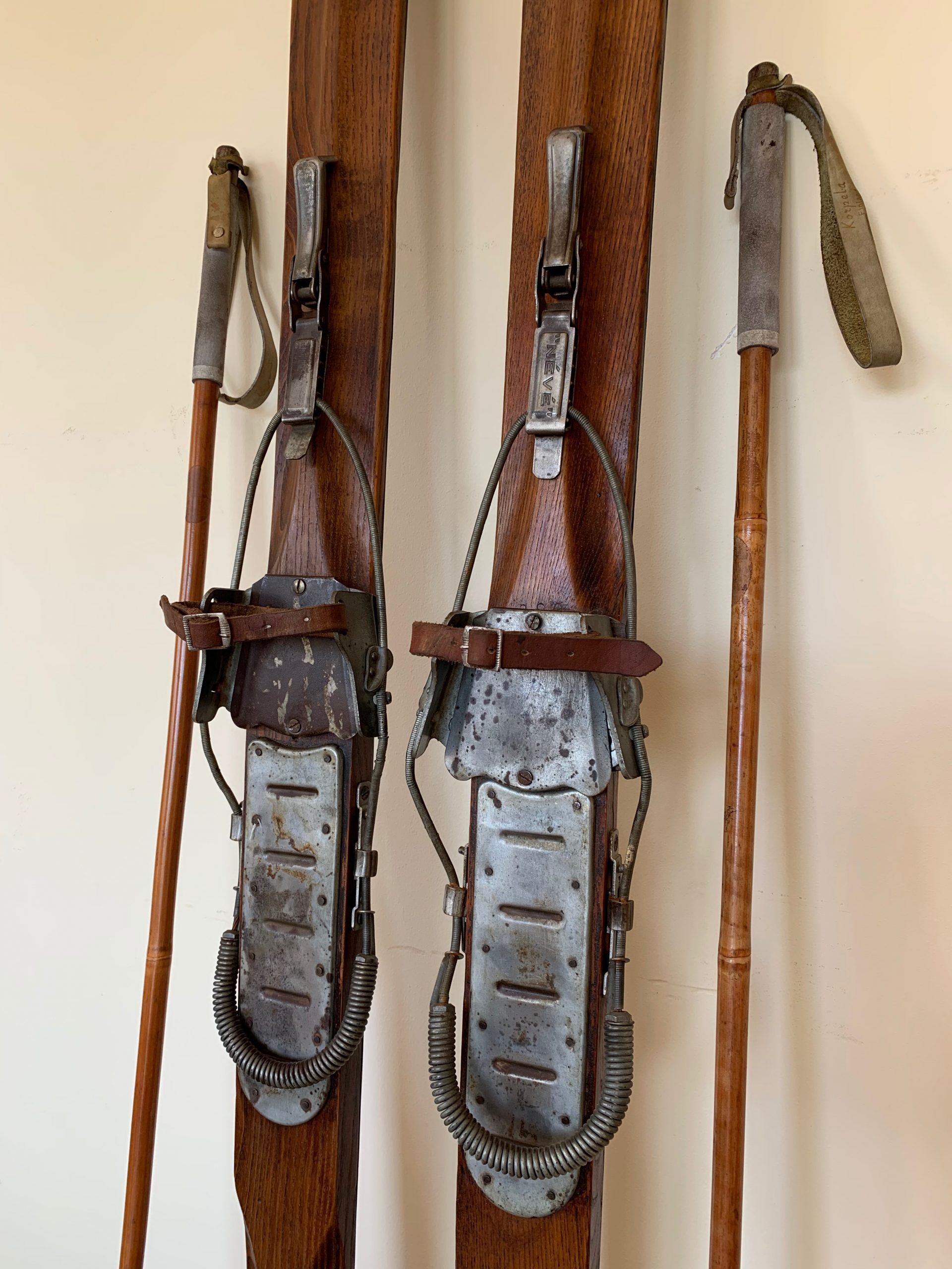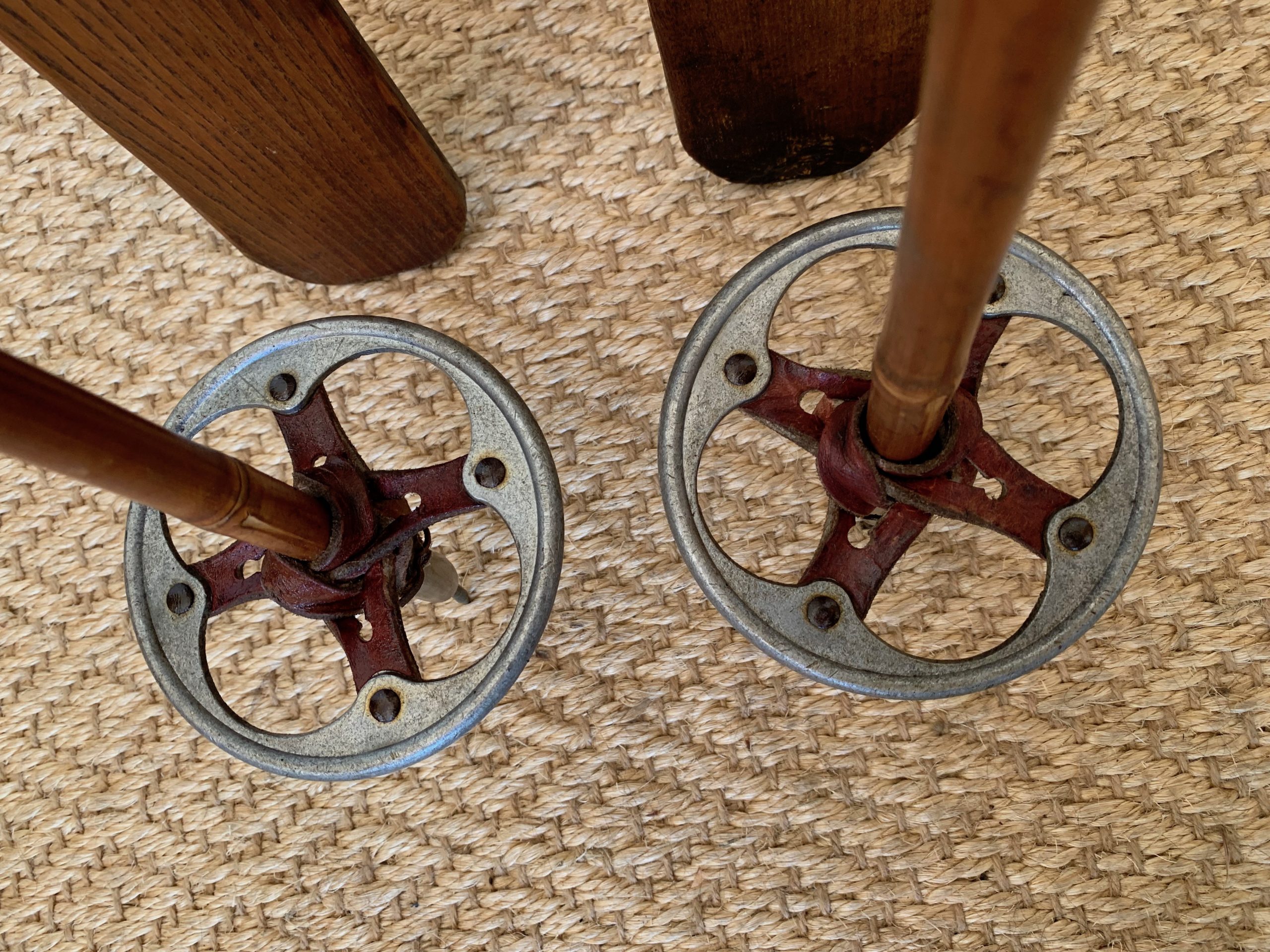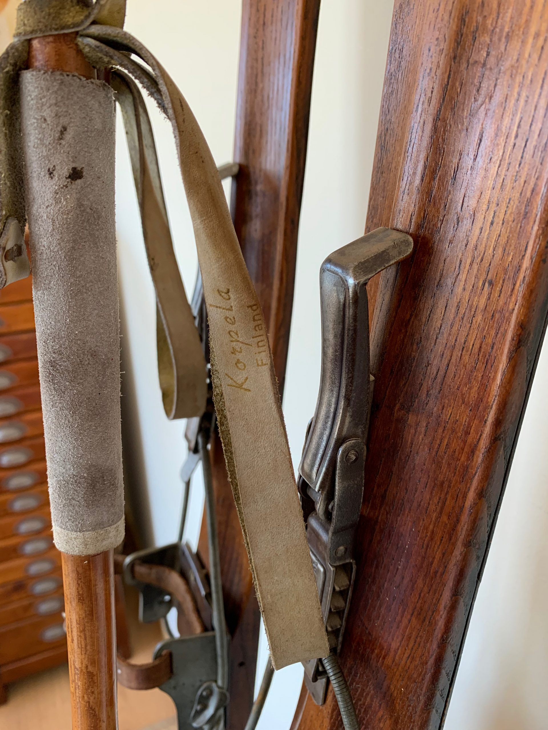 Preciosos esquís alpinos de madera antiguos y bastones. Enormes, completos y originales con preciosa pátina. Madera en relieve, robusta y acabados con las clásicas puntas. Con fijaciones y tiradores Nevé, reposa pies originales y correas de cuero. Bastones de bambú clásicos Korpela fabricados en Finlandia. Empuñaduras y brazaletes de cuero, con discos metálicos y tiras de cuero de 4 puntas. Restaurados conservando su estado original. Preciosa pátina en tono roble medio. Excelente estado! Listos para colgar en la pared de casa de montaña o refugio.