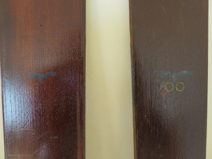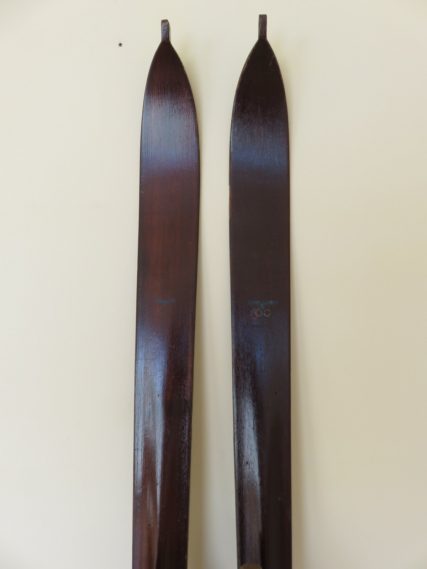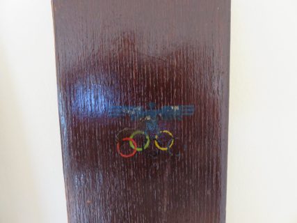 Conjunto completo y original de esquís antiguos de competición. Utilizados en los Juegos Olímpicos de invierno de Garmisch-Partenkirchen en 1936, como esquís de entrenamiento del equipo olímpico alemán. Se puede apreciar el logotipo olímpico y el águila del escudo alemán (ver foto). Fijaciones Silbenmodell.