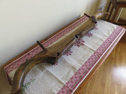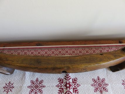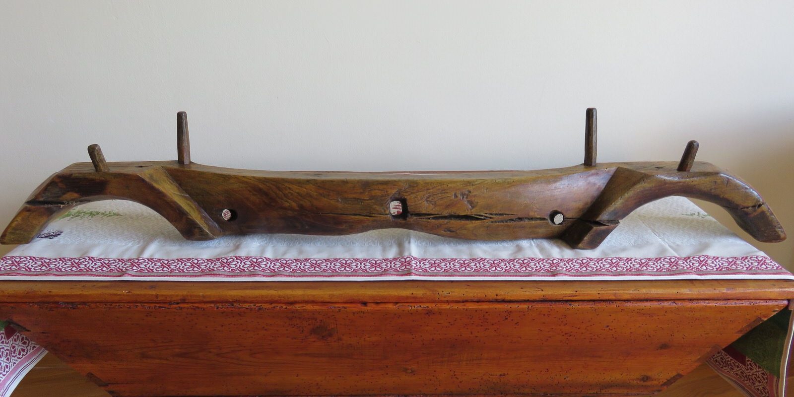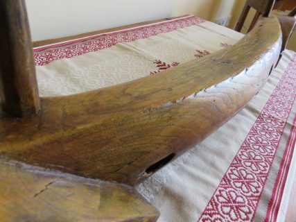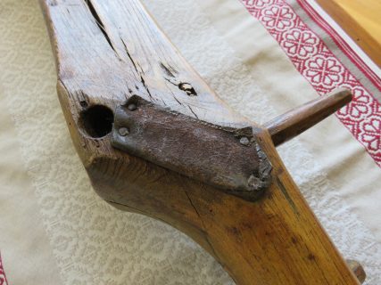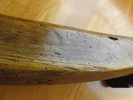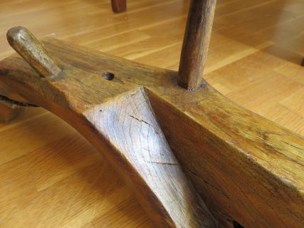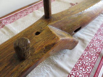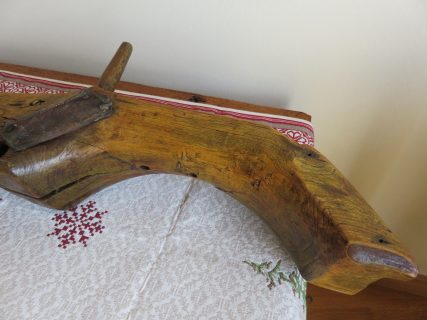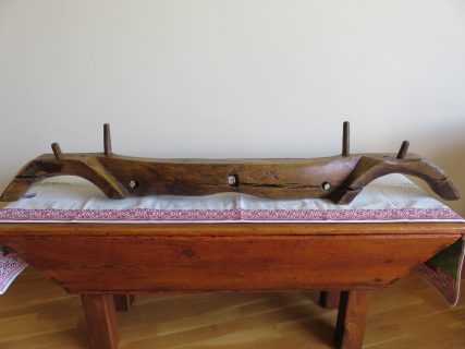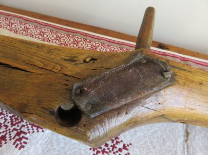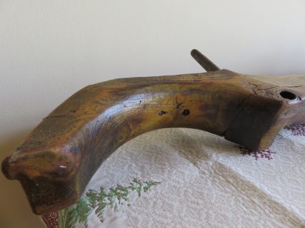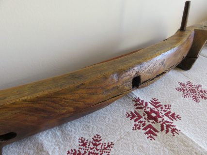 Antiguo yugo de 2 cuellos con sus asas de sujeción. Robusto y pesado. Preciosa línea y vetas de la madera. Con protecciones de cuero para los animales, y grietas abiertas en la madera en las zonas de fuerza, lo que demuestra su uso. Restaurado y acabado con una bonita pátina en tono roble medio. Ideal para colgar en pared de piedra o cualquier ambiente rústico de casa, masía, bar, restaurante, etc.