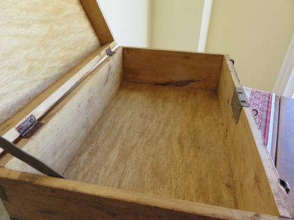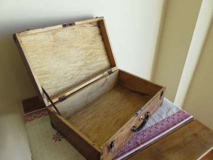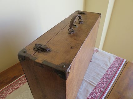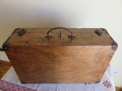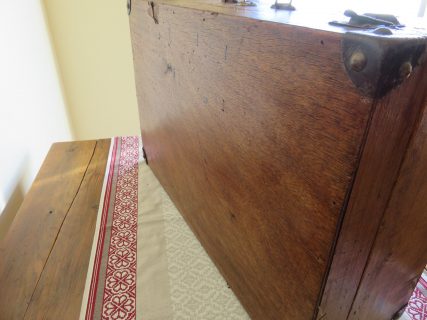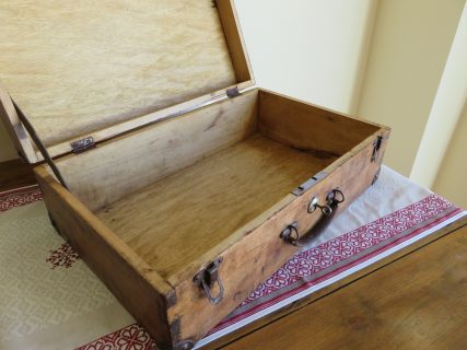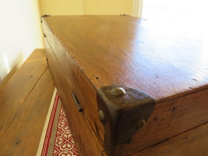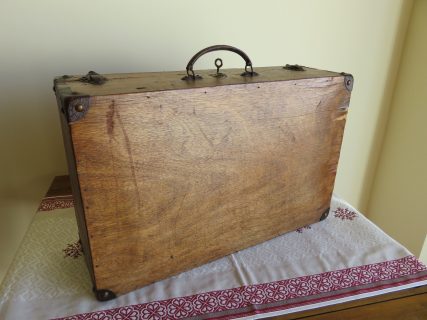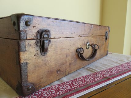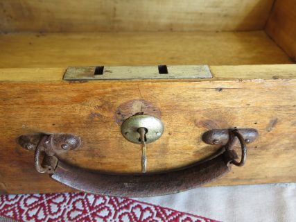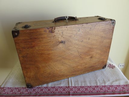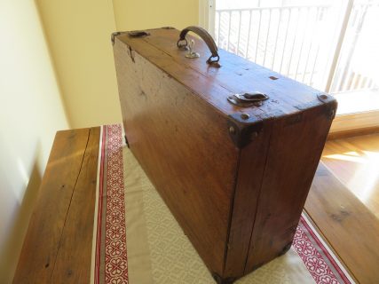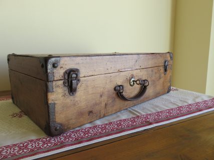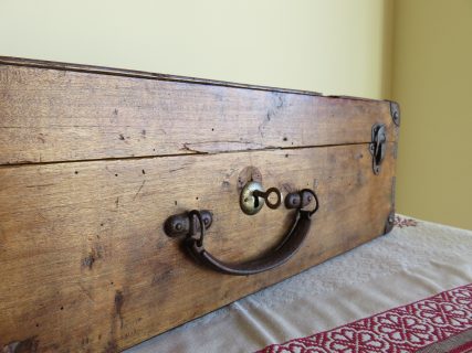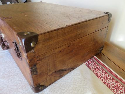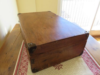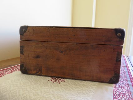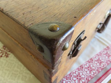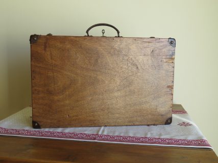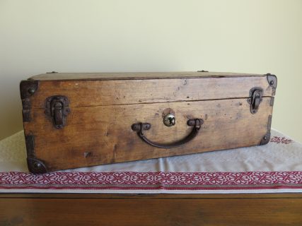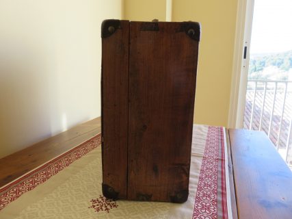 Maleta de soldado de madera muy antigua con pátina en color roble. Con los acabados habituales de la época. Refuerzos metálicos y tachuelas en las aristas, 2 cierres, asa, bisagras, cerradura con llave y tope de cuero. Con muchas señales de uso. Restaurada manteniendo las muestras de desgaste. Pieza muy autentica.