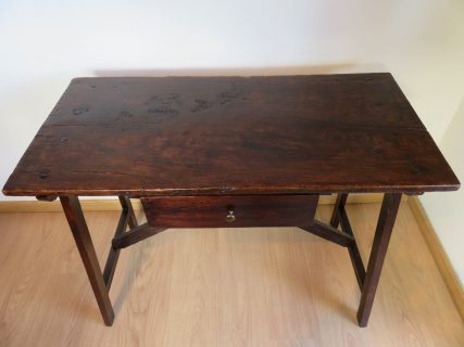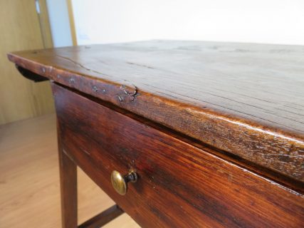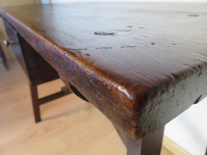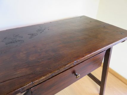 Preciosa mesa tocinera de La Mancha de principios del S.XIX. Auténtica, con estilo y personalidad propia. Todos los detalles y marcas habituales que demuestran su antigüedad han sido preservados en la restauración. Cruzada en la parte central, clavos y tachuelas originales, preciosa pátina. Cajón con tirador nuevo siguiendo el estilo de la época.