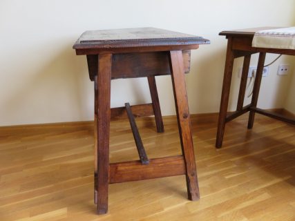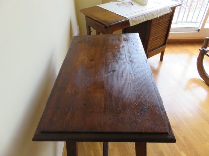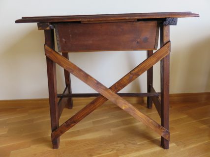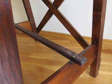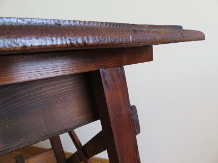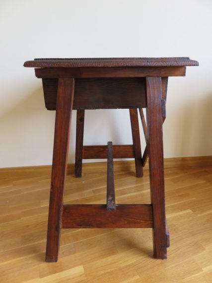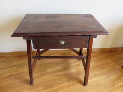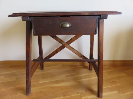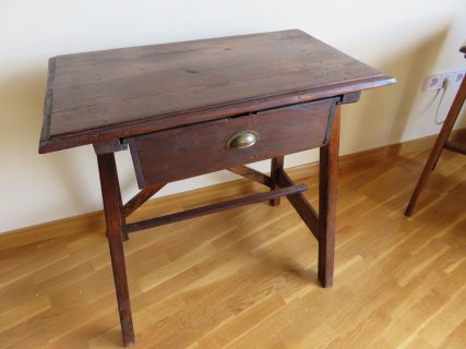 Mesa tocinera de matanza cruzada y con cajón. Restaurada y acabada preservando su estilo original. Con tirador nuevo de latón estilo vintage.