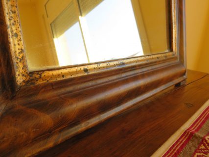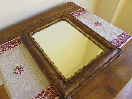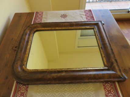 Excepcional espejo de pared francés. Tal cual se encontró. Limpiado y tratado. Precioso y robusto marco de contornos curvados con una pátina fantástica. Borde de pan de oro entre el marco y el cristal intacto que demuestra su antigüedad. El espejo es el original ya que no hay señales de haber reemplazado las 3 tapas de madera traseras (ver foto). Hay una inscripción en la parte trasera lateral del marco. Proviene de palacete señorial de principios del siglo XIX. Creemos que el espejo es del último tercio del siglo XIX, 1870s. Único.