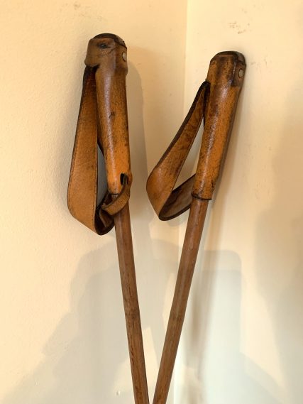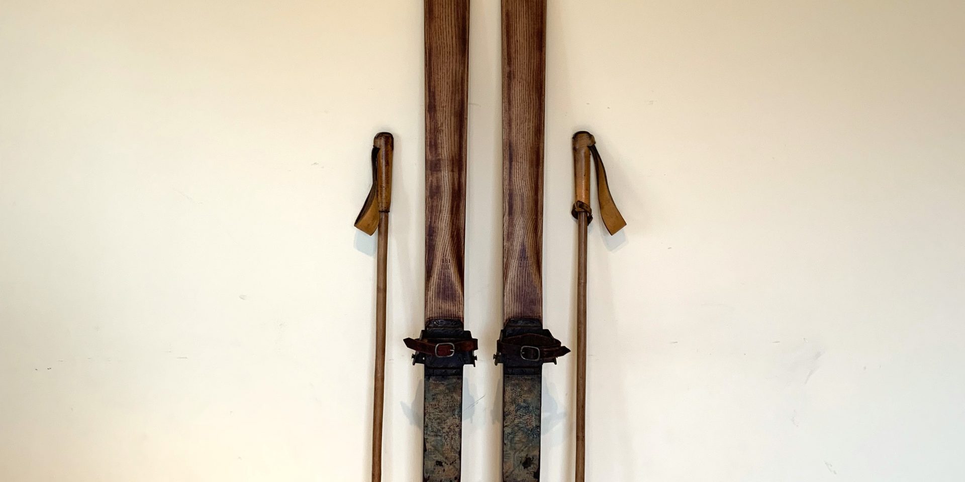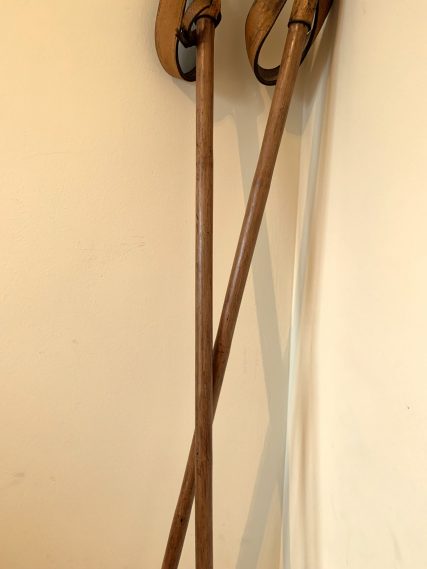 Beautiful vintage wooden skis and poles. Authentic and finished with classic tips. Blades with beautiful grain, length, and serial number marked on the wood. Complete with original bindings and new leather straps. Wooden poles with original leather grips and cuffs. Bamboo discs with 4-point leather straps. Restored to their original condition. Beautiful medium oak patina. Ready to hang on the wall of a mountain home or shelter.