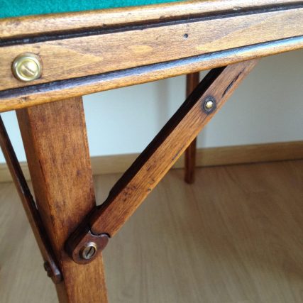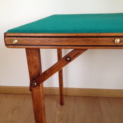 Mesa de juego plegable para 4 jugadores de la antigua Casa de los Juegos de Madrid (ver etiqueta en foto). Totalmente restaurada manteniendo su estilo original y las señales de desgaste. Madera con una preciosa pátina rústica en roble obtenido de mezcla. Tapiz, tachuelas y arandelas doradas nuevas. Original estructura de soportes y batientes de fijación de las patas.