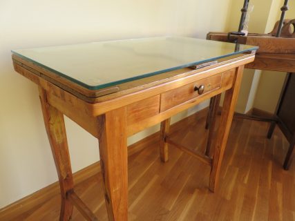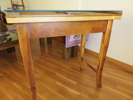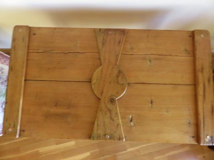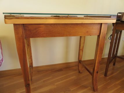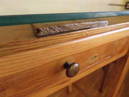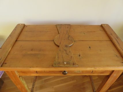 Consola-recibidor con tapa de artesa y cristal. Consola con preciosa línea y diseño con sobre de pino macizo, que sirve de base para una antigua tapa de artesa colocada al revés. Esto permite resaltar la belleza interior de la tapa de artesa. Encima de la tapa se ha colocado un vidrio grueso de calidad con los ángulos redondeados que destaca los detalles del interior de la tapa. El mueble dispone de un cajón con tirador nuevo estilo vintage. Acabado en madera natural siguiendo el tono y las vetas de la consola.