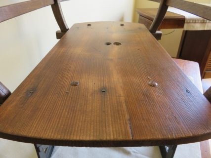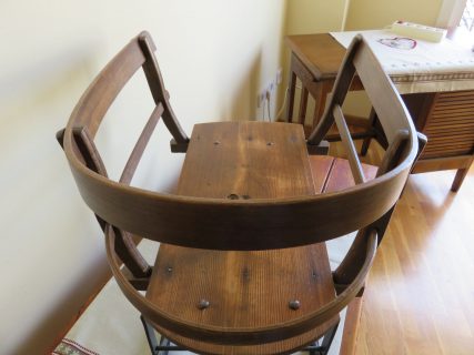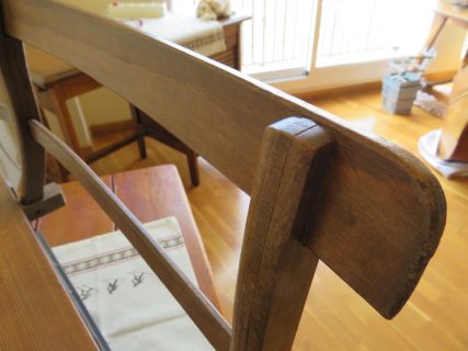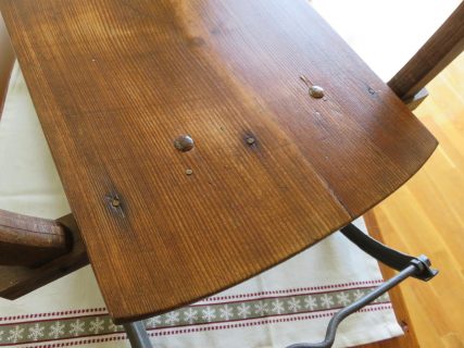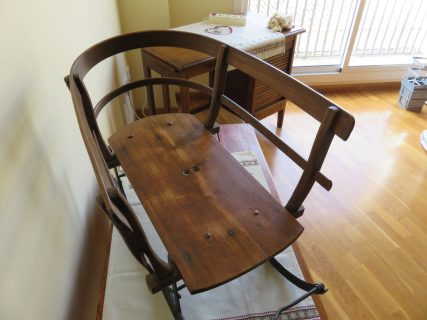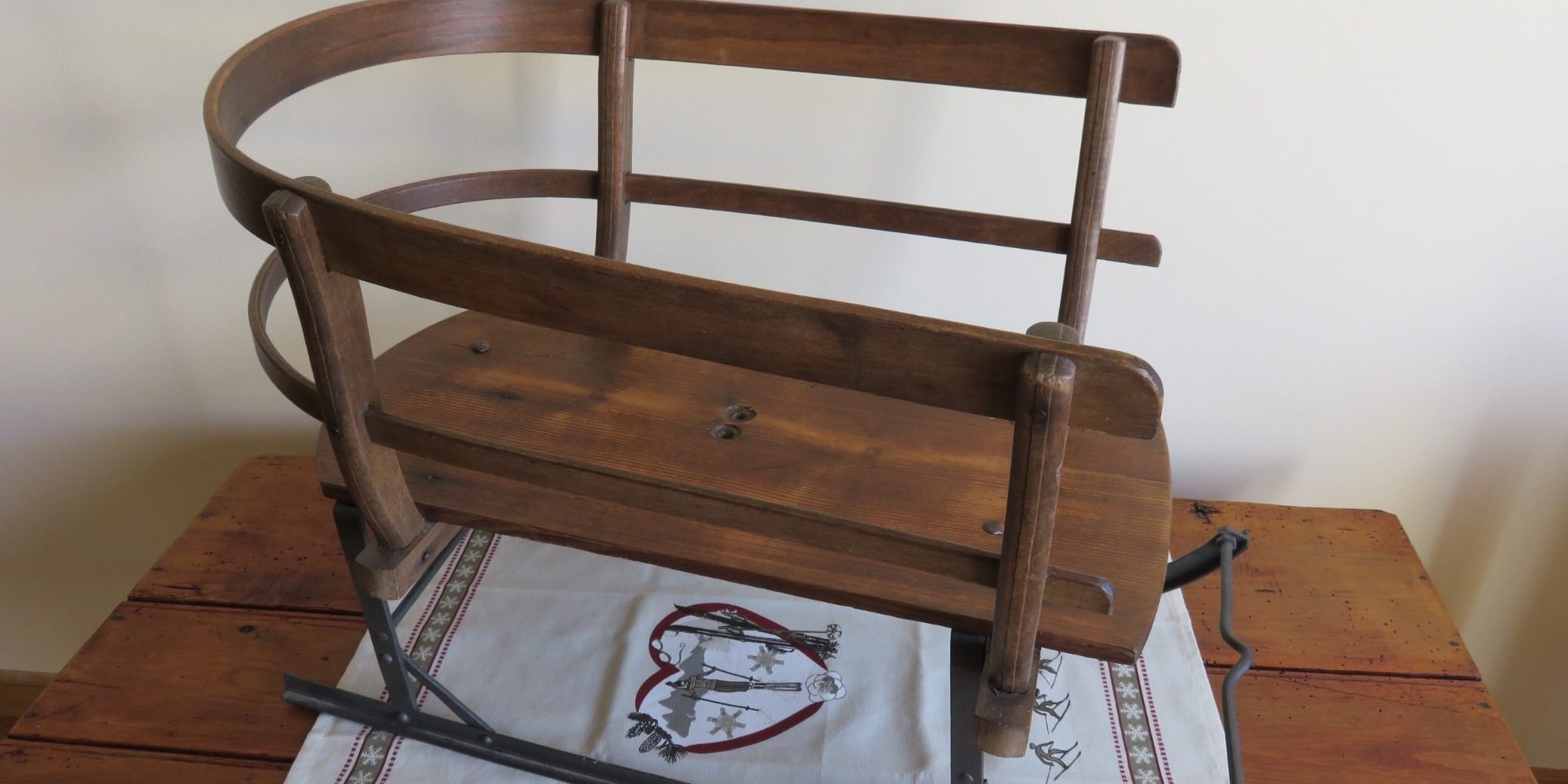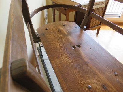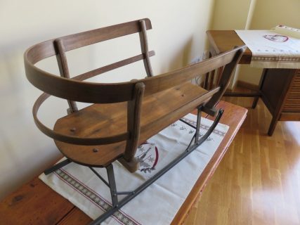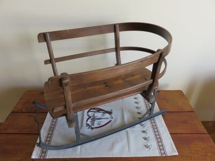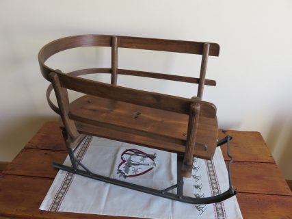 Trineo alemán de niño/a. Restaurado y revisado por completo. Asiento y barandilla de seguridad completos y de una sola pieza. De madera en tono castaño natural. La barandilla está muy bien trabajada y curvada en la parte posterior. Estructura base y raíles de hierro protegidos y pintados siguiendo el estilo original. Barra de anclaje para tirar del trineo.