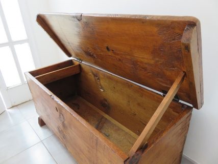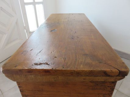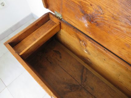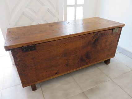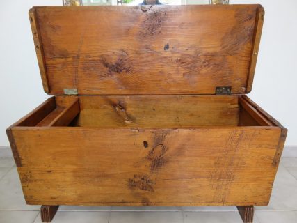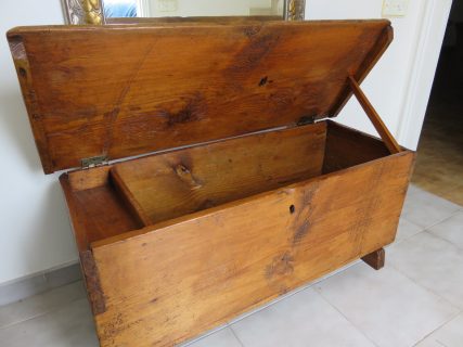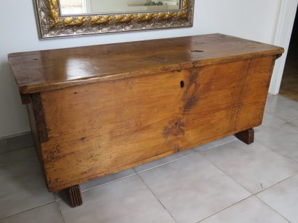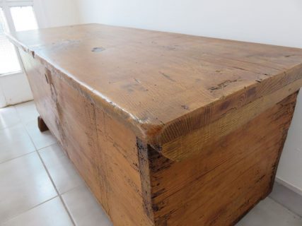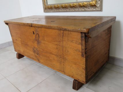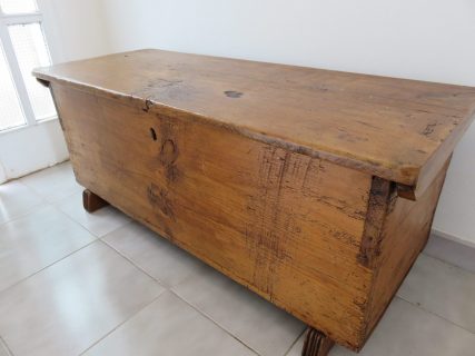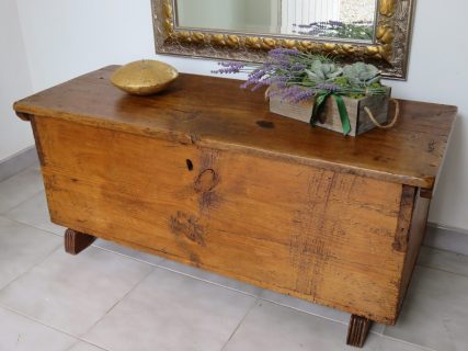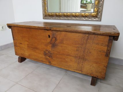 Auténtico baúl rústico de madera maciza de noguera. Con tapa con protecciones laterales, brazo aguanta tapa, patas tipo pie de león y cajón para guardar pequeños accesorios. Robusto y con muchas marcas de uso. Preciosa pátina natural color roble. Restaurado y encerado conservando su estado original. Ideal para entrada o bajos de escalera en ambientes rústicos. Precioso.