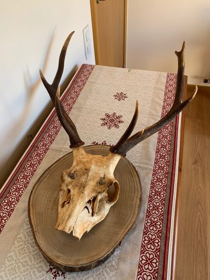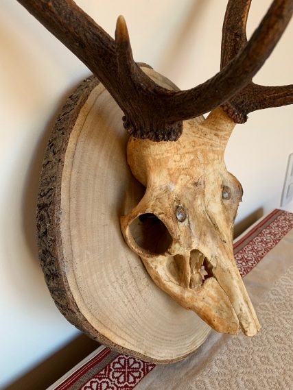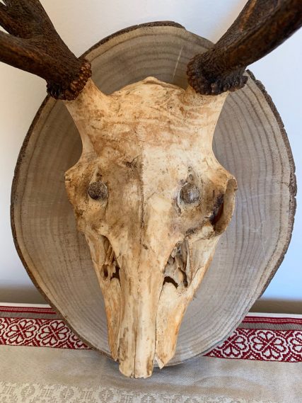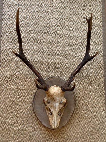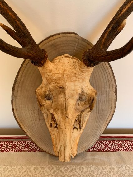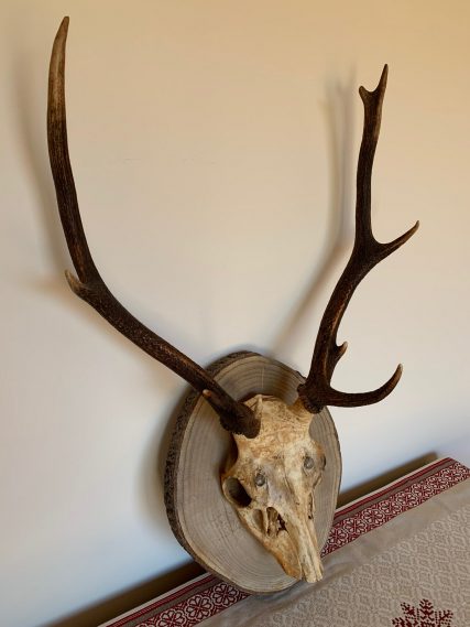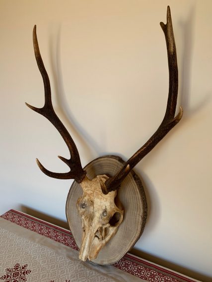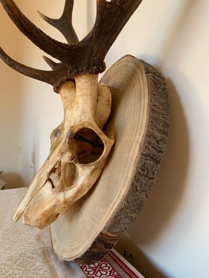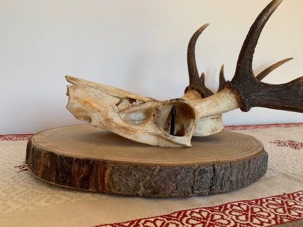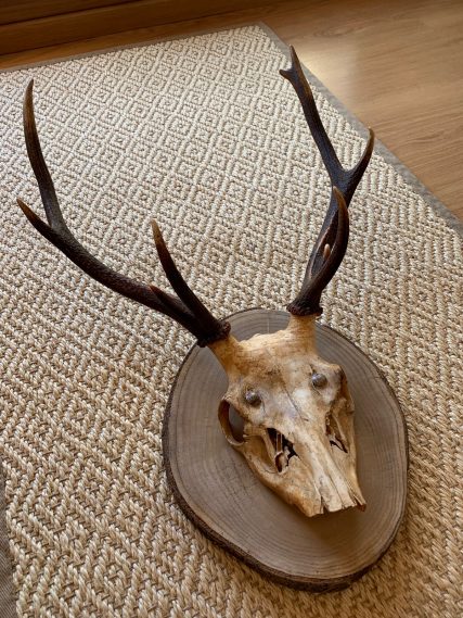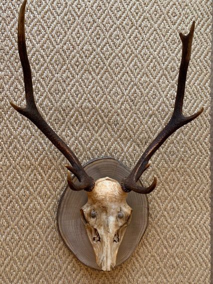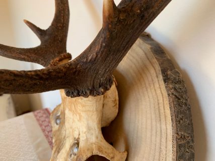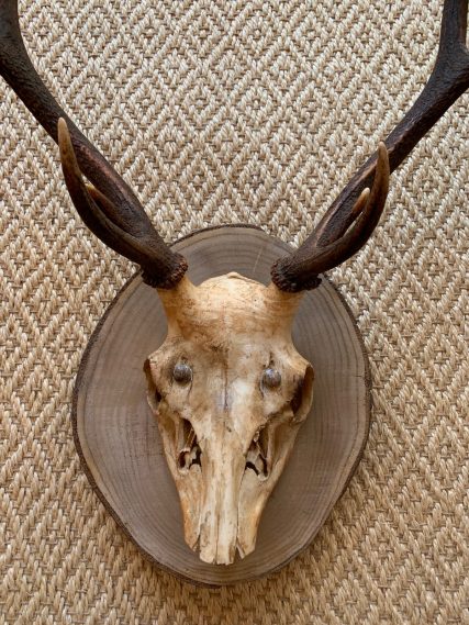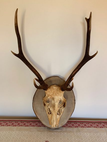 Preciosa cornamenta de ciervo de 9 puntas. Muy equilibrada en sus medidas y de cuerpo redondo. Presentada en base nueva de madera en forma ovalada de corte de tronco con su corteza. Ideal para ambiente rústico y vintage.