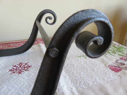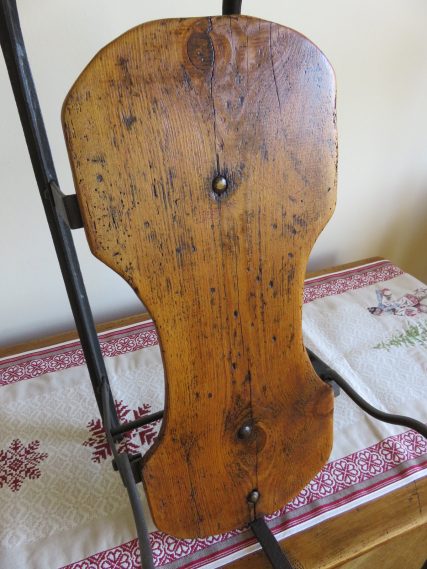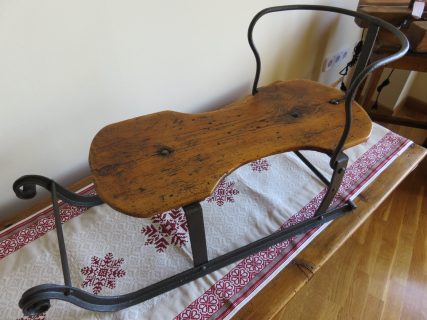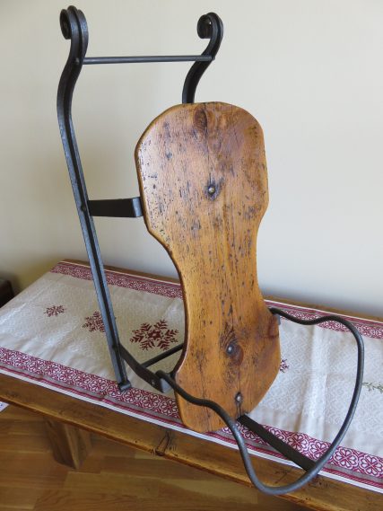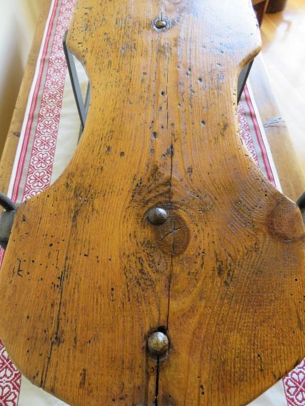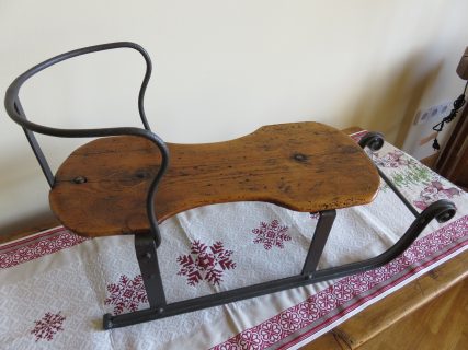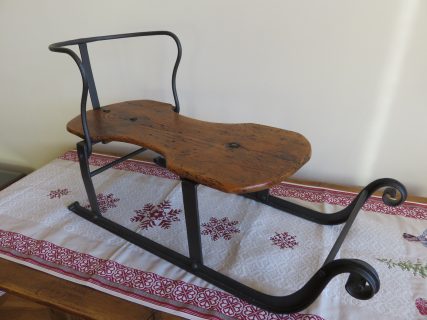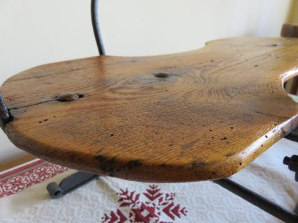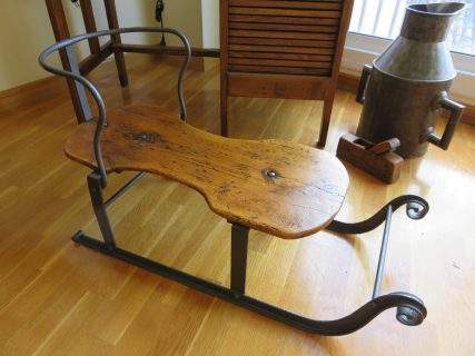 Auténtico trineo de niño con asiento de madera y base y barandilla de hierro. De gran belleza, especialmente por la pátina, forma de 8 y señales del asiento. Pátina obtenida de mezcla entre roble y tonalidad en cerezo. Muy robusto. Restaurado preservando su carácter original. Una pieza totalmente auténtica y original. Pieza única. Una verdadera joya.